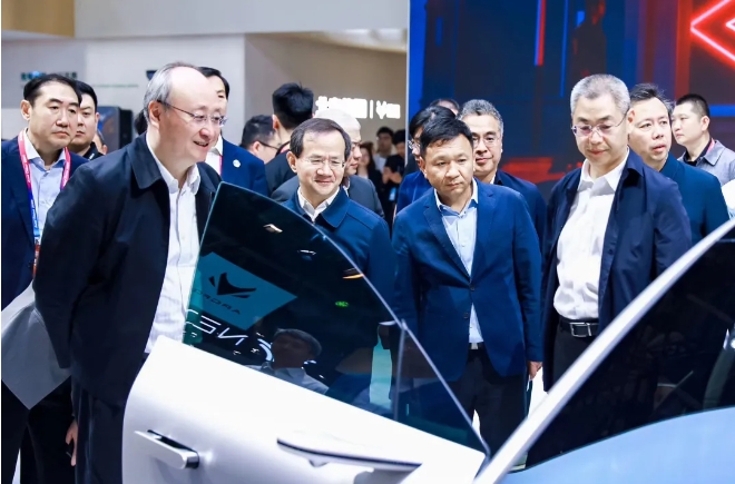 4月26日下午,市委书记尹力,市委副书记、市长殷勇到顺义区调研时,来到北京国际车展,在av色情 展台察看最新车型和创新产品展示。